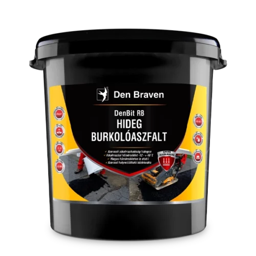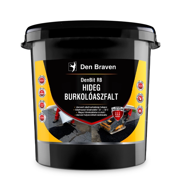 Profi felhasználóknak és magánvásárlóknak egyaránt, háztartásokban is könnyen alkalmazható hideg burkolóaszfalt a ház körüli tömörített felületeken. Alkalmas kátyúzásra, megsüllyedt árok vagy csatorna javítására, hídon, parkolóban, ipari zónában végzett javításokra…stb. A DenBit RB -12 °C és +40 °C között alkalmazható, legfeljebb 5 cm vastag rétegben. Anyagszükséglet: 24 kg/m² 10 mm vastag rétegben.
